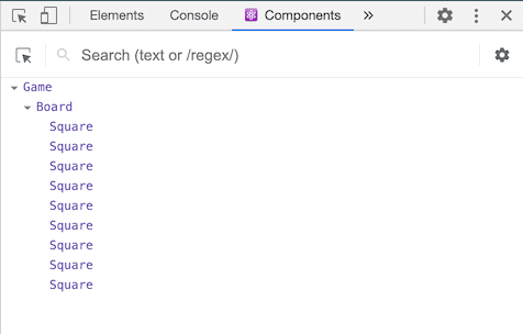 The Square component renders a single <button> and the Board renders 9 squares. The Game component renders a board with placeholder values which we’ll modify later. There are currently no interactive components.